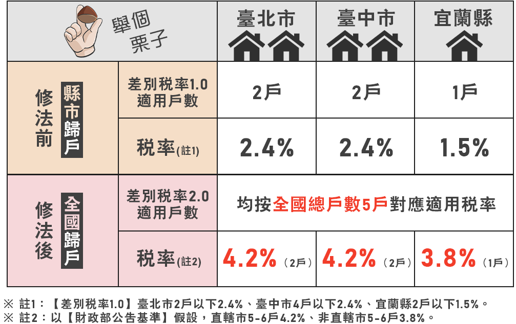 舉例來說,假設一個家庭在新北市、台中市和市各擁有2間住宅(共6間),按照過去的稅制,這六間都可以享受自住稅率。但在全國歸戶的新制下,第四間之後將被列為非自住,並適用更高的稅率。