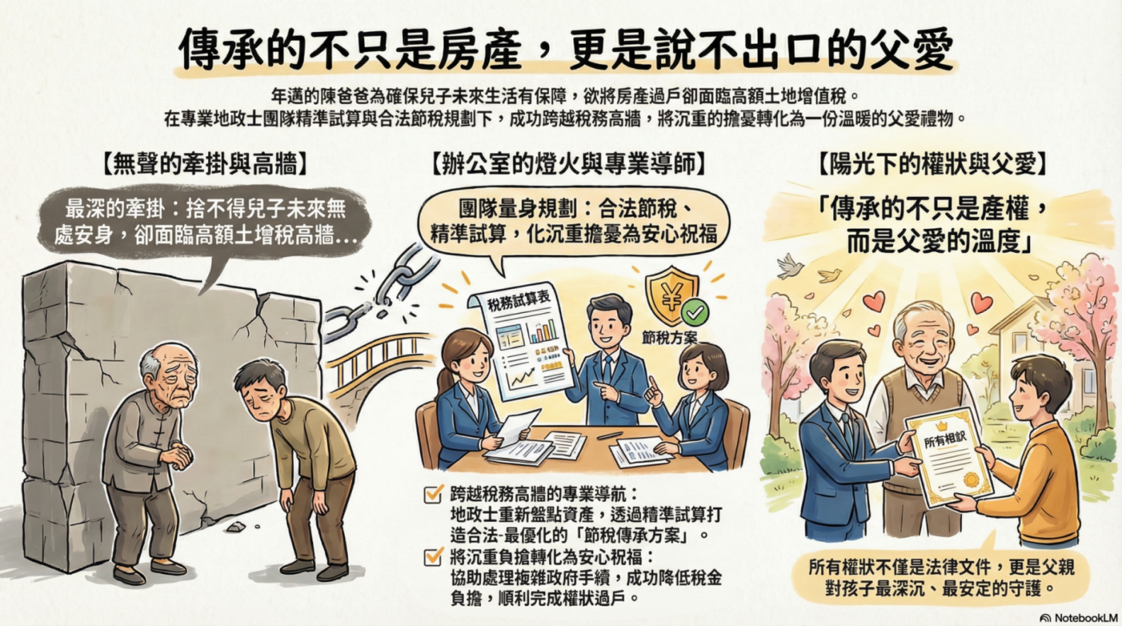 結案那天,陽光灑進辦公室,空氣顯得特別輕快。當何玉珍地政士將那份熱騰騰、剛從地政事務所取回的「全新所有權狀」遞到兒子手中時,陳爸爸長長地吐了一口氣,彷彿卸下了肩膀上扛了十幾年的重擔。